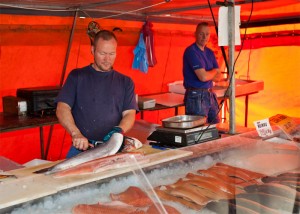 Sainkin varsin herätteleviä näkökulmia sesonkiajatteluun Ravintola Lasipalatsin ruokabloggaajille suunnatussa kalatapahtumassa. Käsittelimme kalajuttuja kokkaajan kannalta ihan alkupisteestä, eli raaka-aineen hankinnasta lähtien. Kauppatorin kalakauppias Tainio kertasi meille tuoreen kalan merkit fileoiden samalla lohia rautaisella parinkymmenen vuoden rutiinilla. Katselin kateellisena vierestä, ja pistin to do -listalle kalankäsittelytaitojen parantamisen :D Samaa vikaa on ilmeisesti jonkin verran muillakin suomalaisilla, sillä suurin osa kalasta myydään nykyään fileenä.